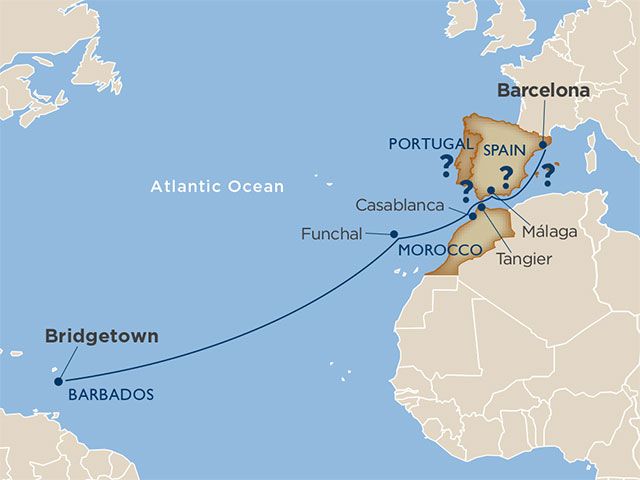 Begin in Barcelona and set out along Spain’s coast with an element of surprise, as each port of call is announced just 36 hours before arrival. The route favors smaller harbors and new-to-Windstar destinations, ending in Málaga after days shaped by shared discovery. From there, the journey stretches westward, stopping in Tangier, Casablanca and Madeira, before committing to the Atlantic. Long sea days create time to settle into life onboard, turning distance into part of the experience and arriving in Barbados with a real sense of passage.