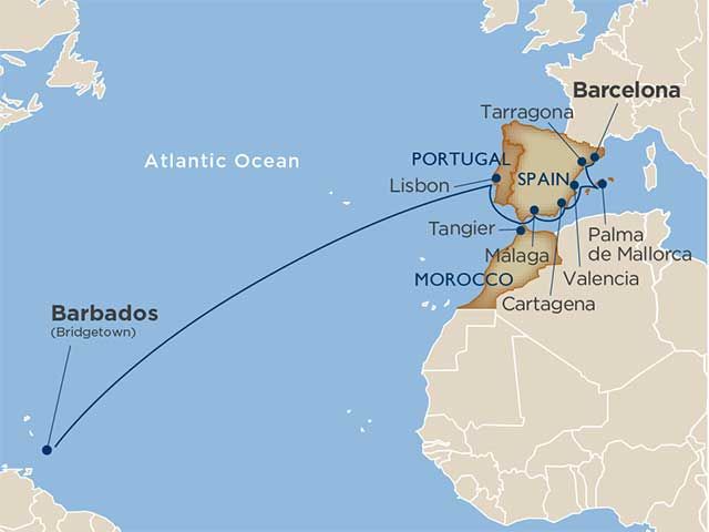 Ideal for anyone seeking equal portions of relaxing time at sea and port visits, this transatlantic crossing features a combination of leisurely, uninterrupted sea crossing time balanced with the best ports in the Western Mediterranean. Spend time crossing the Atlantic and enjoy the romance of sailing as you make your way to your ultimate destination. Sip port wines in Lisbon, Portugal, browse wares in the bustling Grand Souk in Tangier, Morocco, and wander the medieval cobbled streets of Tarragona, Spain.