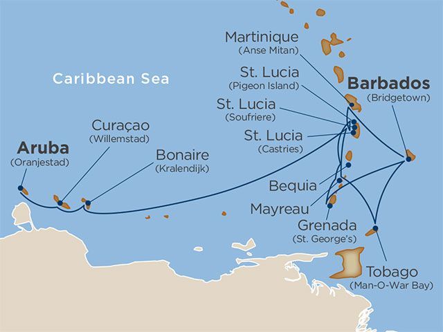 Begin in Barbados with a visit to Harrison’s Cave before setting sail for the French-Caribbean splendor of Martinique, where Empress Josephine spent her childhood. In St. Lucia, enjoy the bustling capital of Castries, and an overnight stay on Pigeon Island with a visit to the majestic Pitons. Follow your nose through the aromatic open-air markets of beautiful St. George’s on the “Isle of Spice.” Enjoy the exclusive Signature Beach Party on Mayreau, and walk up Mount Pleasant to witness the amazing view from Fort Hamilton on Bequia. Swim with sea turtles in Tobago Cays Marine Park, and bring binoculars for birdwatching in Bonaire. Savor the pastel colors of Old Town Willemstad and explore the limestone formations and ancient petroglyphs of Hato Caves. Complete your voyage in Aruba, where you can relax and take in some of the Caribbean’s best beaches or play dominoes with locals.