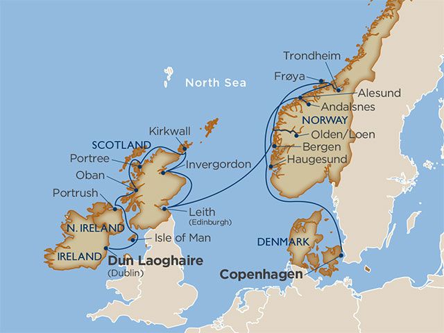 Savor the sight of indigo fjords and colorful fjord towns, and delve into Celtic culture from Scottish tartans and historic Highland castles to lively Irish celidhs. Incredible scenery takes many forms: Rapunzel-like waterfalls, romantic ruins, crooked old warehouses, wild islands. And with a mix of popular ports and several small maiden ports, there’s always something new to discover. Explore Bergen’s UNESCO wharf and Alesund’s famous Art Deco architecture – two towns in a neck-and-neck race for the most picturesque fjord city. Discover neolithic ruins on remote Scottish isles, sip local tipples from Guinness to whisky, and trace legends to their source at the Giant’s Causeway and Loch Ness. This unique itinerary includes maiden calls to tiny fjord towns like Andalsnes, Froya, and OldenLoen, as well as Trondheim, Norway’s charming and walkable first capital.
