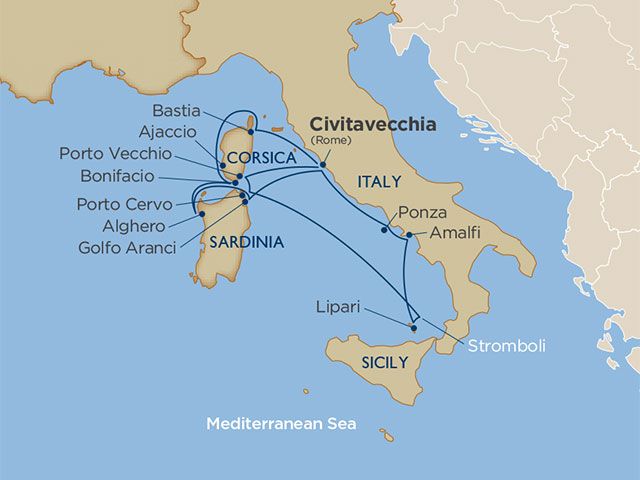 Sail to Italian islands with unique cultural heritage, and to small resort-style ports popular with well-heeled but laid-back Europeans. Rocky coves and vivid blue waters make these islands worth visiting. Enjoy the view as you approach the tall limestone cliffs supporting the medieval town of Bonifacio on Corsica, cruise past Stromboli Volcano, and call at the mainland port of Amalfi where the coastal scenery is literally legendary. Explore all this beauty with activities ranging from dolphin watching to kayaking to bicycling on the bucolic island of Lipari. You’ll find an abundance of history and culture to boot, from Bronze Age ruins to Napoleon’s Corsican legacy, and artsy seaside towns like Sardinia’s Bosa, where colorful houses catch the eye, and the 12th-century castle is almost an afterthought. Enjoy after-hours treats from illuminated fortresses to artisanal sunsets in Alghero.