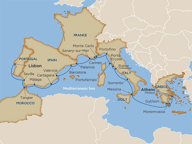 Experience Seville, the birthplace of Spanish flamenco, with its Gothic cathedral and the Triana Bridge. Take in the "Blue City" of Chefchaouen, with blue-washed buildings tucked into the Rif Mountains. Enjoy Granada’s Alhambra, the 13th century fortress complex. Discover Cartagena, from the Roman Theater and Museum to the architecture of Town Hall Square. Explore Valencia’s Lladro Art Center, with handcrafted porcelain figurines and sculptures. Bike old Valenica to the Silk Exchange, passing the Turia Gardens. Swim the waters of Palamós. From the beaches of Sanary-sur-Mer to the limestone cliffs of Cassis and the countryside of Aix-en-Provence. Spot celebrities at the Festival Palace in Cannes and the Monte Carlo Casino. Hike cliff paths in Portofino. Explore ancient treasures of Rome. Explore the craters and lava flows of Mount Etna and the tiny cobblestone streets of Monemvasia.