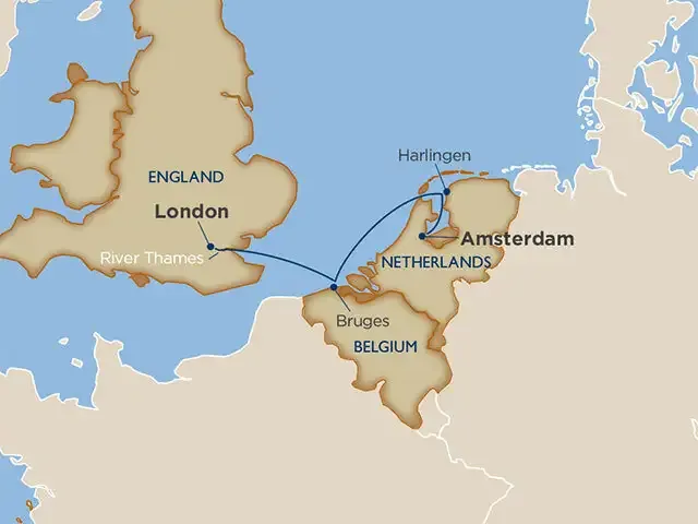 Begin your journey in the center of London with the unforgettable small-ship experience of sailing beneath the iconic Tower Bridge. Cross the North Sea to Bruges, where canals, medieval squares, and chocolate shops make every street feel like a postcard. Continue to Harlingen, a true Dutch harbor town that blends maritime tradition with authentic local charm. Your voyage concludes in Amsterdam, famous for its winding canals, world-class museums, and lively café culture. This shorter itinerary offers the perfect taste of Northern Europe, combining iconic destinations with rare small-ship exclusives.