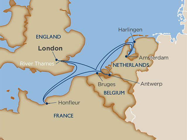 Travel from London to Amsterdam and back again on a thoughtfully paced Northern Europe itinerary shaped by river access and overnight stays. Small-ship sailing allows passage beneath Tower Bridge and docking in city centers, with extended time in London for museums, markets, and historic neighborhoods, and overnights in Antwerp to explore Flemish art, fashion, diamonds, and dining after dark. Along the way, Bruges offers medieval streets, canals, and chocolate traditions; Harlingen reveals a working Dutch harbor with deep maritime roots; and Honfleur invites strolls along its old basin of half-timbered houses and access to Normandy’s coast.