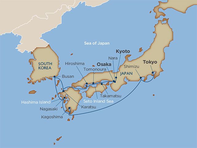 From the tranquil Zen beauty of Kinkaku-ji Temple to the neon plasma screens and incessant press of pedestrians throughout Tokyo’s Shibuya Station, this tour throughout Japan combines pristine natural beauty with cosmopolitan contrasts. Nibble on the freshest of fish paired with soy sauce and wasabi in the famous Shimizu Fish Market. Meander among East Asian relics and prehistoric stone tools in Busan’s museums, and royal tombs in Gyeongju, one of South Korea’s most famous UNESCO World Heritage Sites. Sip green tea in the peaceful shade of the scenic Ritsurin Garden in Takamatsu, or participate in a formal tea ceremony. Examine Kyoto’s storied Nijo Castle in detail as part of an inland stay, or explore the Zen temple Todai-ji in Nara. This is a perfect journey for those who love Japan, and adventurous travelers who want to go further inland to explore the culture and history of Kyoto.