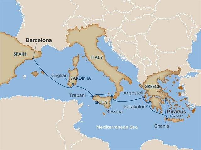 Beneath the chic beaches and trendy cafés, modern Mediterranean crossings trace Europe’s evolution of art, architecture, and history. Set sail amid the vibrant hues of Bronze Age Minoan frescos in the east, transition to lifelike Italian Renaissance marble sculptures, and finish amid the colors, curvatures and complexities of Barcelona’s urban artwork embodying Catalan’s flamboyant Modernisme movement. Venture from weathered temples and vistas atop Greece's mountains to imposing 16th-century Sicilian watchtowers — and the contemporary scaffoldings surrounding Barcelona’s ornate and incomplete Sagrada Família. Chart early Greek triremes trade routes to Egypt and Rome, and imagine hoisting sails 2,000 years later in the company of Spanish and Portuguese explorers bound for still-rumored continents.
