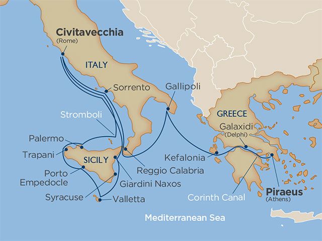 Circle Sicily and browse stunning Italian coastlines, authentic Puglian towns, enchanting Greek islands, and iconic ruins. Cross the Corinth Canal, a historic channel only wide enough for small ships like ours. Encounter restless volcanoes from Mt. Vesuvius to Mt. Etna to nighttime cruising past Stromboli, tears of glowing lava often streaming down its face. Walk in the footsteps of the past at Pompeii, the Oracle’s shrine in Delphi, the Valley of the Temples in Porto Empedocle, and Valetta’s cathedral. Discover Puglia’s Greek heritage in relaxed, authentic ports like Gallipoli and Reggio Calabria, and gaze in awe at the giant Greek theater in ancient Syracuse, a venue the size of the Hollywood Bowl hewn by hand from the pale limestone. From street food to wine tastings, Greek ruins to Rome’s incredible wealth of antiquities, this voyage makes every day one to savor.
