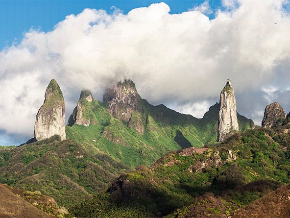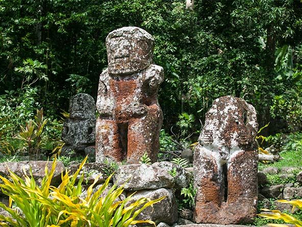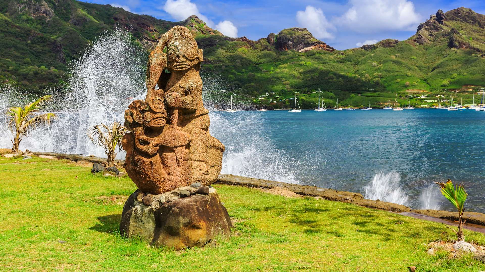 The second largest island in French Polynesia, this remote island is full of natural beauty in is deep bays, lush valleys, rocky peaks and narrow cliffside roads where you might come upon wild ponies. Giant banyan trees are found around ancient marae temples and ceremonial stone platforms as well as tiki statues outside huts. Find the 40-foot-tall Tiki Tuhiva sitting atop Mount Muake. Another interest is Tohua Koueva Archaeological Site with detailed restoration of ancient Marquesan life.