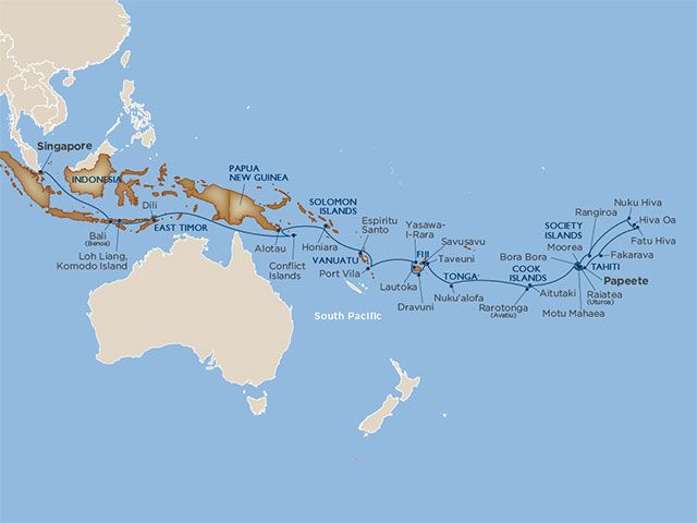 Visit 26 distinct ports across 8 island groups, spanning Polynesia, Melanesia, Micronesia, and Southeast Asia.