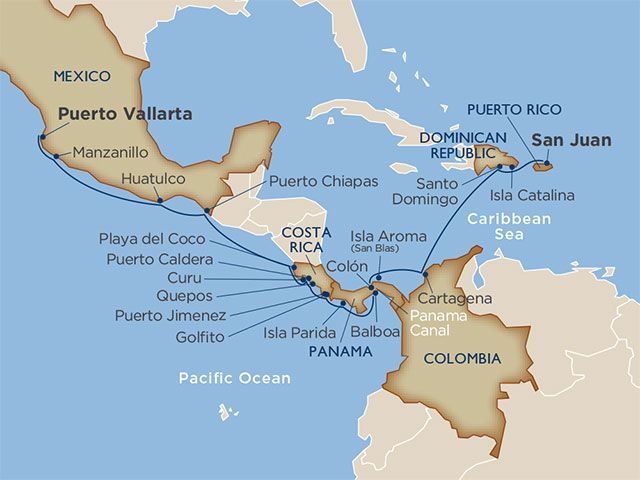 Indulge in white sand beaches, steamy rainforests and local cuisine on both sides of Central America during a voyage across the Caribbean and through the Panama Canal, with stops throughout the Dominican Republic, Colombia, Panama, Costa Rica and Mexico. Snorkel with sea turtles and friendly stingrays during a beachside visit to the Dominican Republic's Isla Catalina. Descend into subterranean limestone caverns and lakes at The Three Eyes National Park outside Santo Domingo. Stay out late dancing, then dine on crunchy Colombian empanadas and flaky Mojarra fish during an overnight stay in Cartagena. Relax during a guided daylight transit of the Panama Canal, then catch the sunset at a waterfront café during an overnight Balboa port stay. Discover Costa Rica's diverse wildlife amidst breathtaking, mist-covered cloud forests. Savor fresh coffee at a tasting in Puerto Chiapas, Mexico.