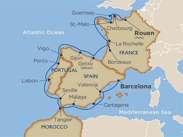 Uncover a wealth of treasures on a remarkable voyage from Paris, France to Barcelona, Spain, enriched by multiple overnight port stays. Your journey begins with an overnight stay in Rouen, offering time to explore Paris's iconic landmarks such as the Eiffel Tower and the charming Montmartre district. From there, sail down the western coast of France, where four days among Bordeaux's vineyards await, providing a perfect opportunity for exploration and wine tasting. In St. Malo, walk along the medieval fortifications, delving into the city's storied maritime past. As the cruise continues through the Iberian Peninsula, experience Bilbao, renowned for its contemporary art and architecture. In Seville, marvel at the grandeur of the Alcázar and soak in the vibrant-historic city. The adventure extends to Tangier, where the exotic charm of Moroccan souks and promise a truly immersive experience.