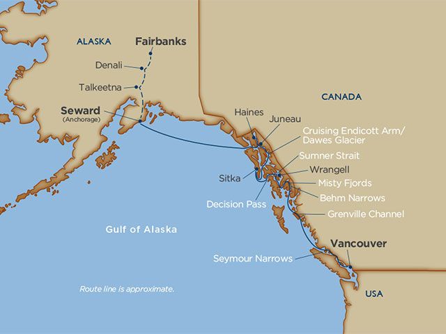 Be out on deck for scenic cruising of the beautiful Inside Passage between Anchorage and Vancouver looking for wildlife along the way.
